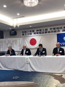 参加者:落合平塚市長、佐藤茅ヶ崎市長、木村寒川町長、村田二宮町長、神奈川県中小企業団体中央会 森会長、東京電力パワーグリッド㈱平塚支社 山口支社長、県工組 鈴木理事長 含め来賓者:52名 組合員:50名 事務局:2名 計104名