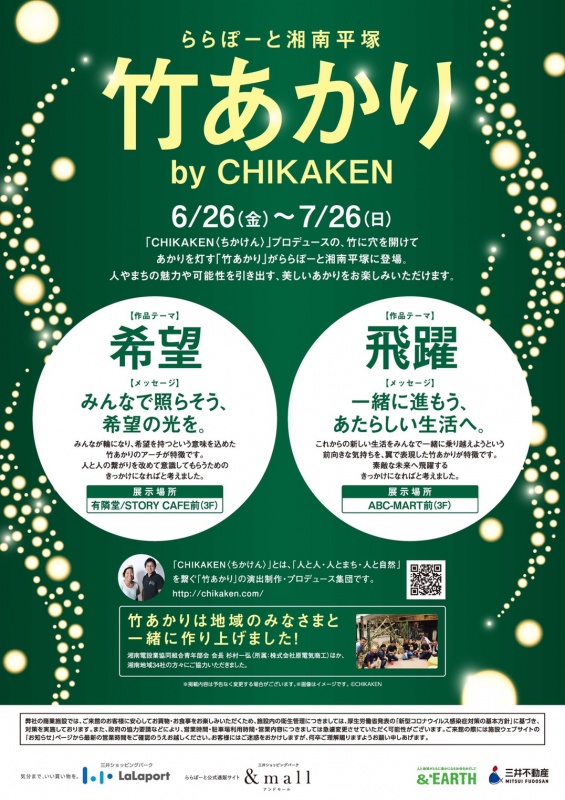 2021.7.3 平塚まちかど広場にて平塚市立旭陵中学校の学生さんたちと一緒に作成した竹あかりや3M級の長物を設営致しました。